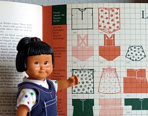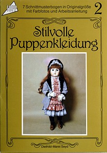 Parallel zur „Puppenwelle“ unserer jüngsten Vergangenheit, der Freude am Sammeln alter Puppen, am Fertigen von Nostalgie- und Repropuppen, am Aufkommen von Künstler- puppen, ergab sich die Notwendigkeit, stil- und typgerechte Kleidung zu schneidern. Nachdrucke alter Schnittmusterbögen erschienen ebenso auf dem Markt wie neu geschaffene. Als ein Beispiel unter vielen sei „Stilvolle Puppenkleidung“ von Diethild-Marei Seyd genannt, „7 Schnittmusterbogen in Origi- nalgröße mit Farbfotos und Arbeitsanleitungen“. Zögernde Leser versucht die Autorin mit dem Hinweis zu locken, dass man schon ein wenig Geduld zum Selbernähen von Puppenkleidern brauche, aber „Sie werden sehen, Puppen sind dankbare, geduldige Partner bei der Anprobe!“ |