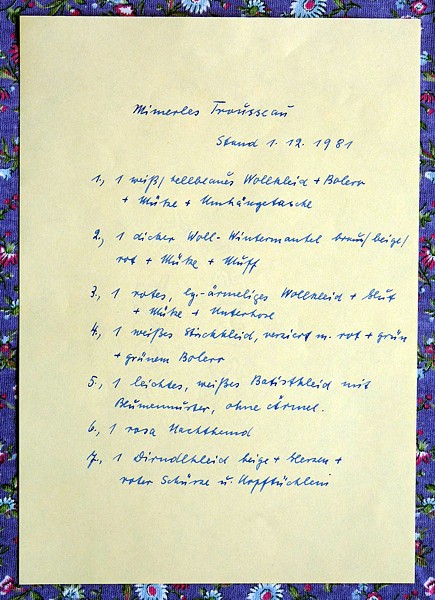 So fehlt z.B. Zubehör aller Art: Schneiderpuppen, Nähmaschinen, Maßband, Nähkästen, Scheren, Nadelbüchlein, Garnrollen, ganz zu schweigen von Kleiderbügeln, Bügeleisen, großen Spiegeln und Kleiderschränken …