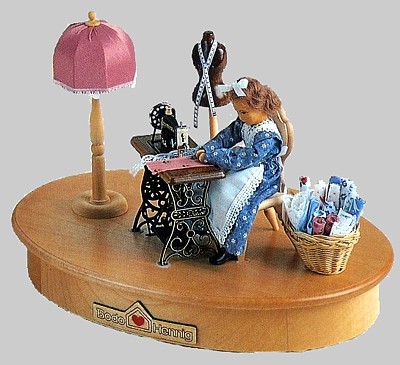 Puppenhaus-Schneiderin Mitsamt kompletter Bodo Hennig-Ausstattung (Nähmaschine, Stuhl, Stehlampe, Schneiderpuppe mit Maßband, Korb mit Stoffen, Nähkasten) sitzt sie auf einer drehbaren Holzscheibe. Dieser Automat, von dem etwa siebzig Exemplare gefertigt wurden, war als Schaufenster-Blickfang gedacht, hat aber inzwischen wohl den Weg in Museen oder Privatsammlungen gefunden. |