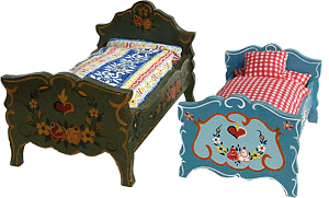 Nun hat Kuhn ja nicht nur Himmelbetten gebaut. Es gab selbstverständlich auch schöne Betten. Eins der schönsten Betten von Dora Kuhn sehen Sie links. Sammlung und Foto Gabo Richter. Frau Richter hat die Bauernstube aus ihrer Sammlung in der Tortula 4/2010 bereits vorgestellt. Es ist nämlich eine Stube mit Geschichte. Vergleicht man nun die Bemalung vom Fußende des Bettes mit der auf meinen beiden Himmelbetten aus den 30er Jahren, so erkennt man zweifelsfrei - sie stammen aus einer Zeit! Besonderes Merkmal bei Bettwäsche aus dieser Zeit ist die Füllung mit Holzwolle. Die Kissen und Decken sind damit gestopft. Ich lege meine Kissen aus der Zeit übrigens immer für ein Paar Tage in die Gefriertruhe. Man weiß ja nie, wen oder was man da so ins Haus bekommt. |