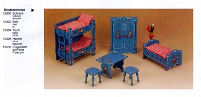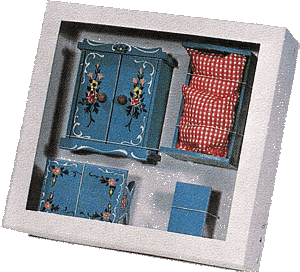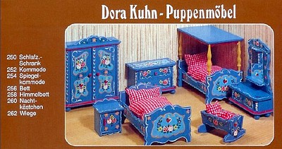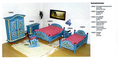 Vielleicht wollte doch nicht jeder Fan der Bauernmöbel ein Zimmer in orange. Jedenfalls kamen ein paar Jahre später diese Möbel auch in blau aus Fischbachau in die Puppenstuben. Trotz meiner großen