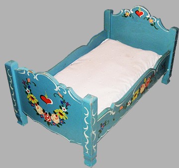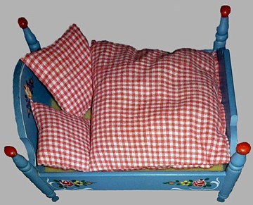 bayrisch blau Doch es waren nicht nur optische Veränderungen. Es gab nun eine „Matratze“ aus Schaumgummi und die Decken und Kissen - im rot-weißen Vichykaro, wurden bereits mit Füllwatte und nicht mehr mit Holzwolle gefüllt. Das Bett hatte halbhohe Pfosten, die mit einer kleinen roten Kugel gekrönt waren. |