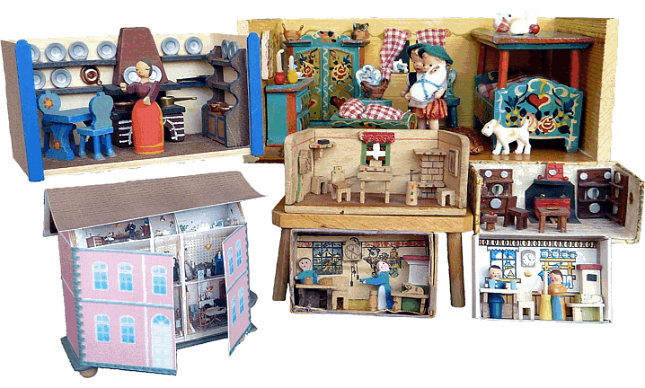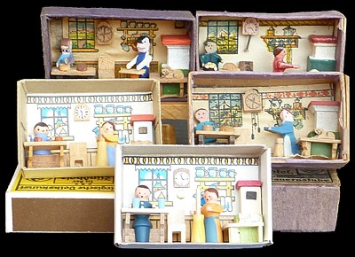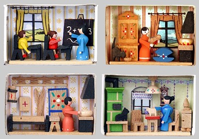 Eigentlich kann man alle Berufszweige in einer Zündholzschachtel wieder finden. Dörfer, Eisenbahnen, eine Windmühle, Turner, Weihnachtsschmuck und Osterdekoration