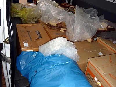 Am 02.11.2010 war es so weit, die Mitarbeiter des Museums, Herr Gehlen und Herr Frank, kamen mit einem großen Auto vorgefahren und trugen alle Kästen raus. Interessant für mich war, dass sie viele Säcke im Auto hatten, die mit Luftpolsterfolie und Styropor-Teilen gefüllt waren. Diese Säcke wurden in die verbliebenen Leerräume gesteckt und hinderten die Kartons am verrutschen. Eine tolle Lösung. |