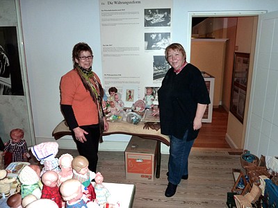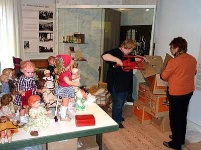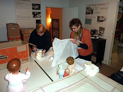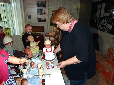 Am 9. November - ich hatte zwischenzeitlich Antibiotika bekommen, aber es ging mir immer noch nicht besser, fuhren wir zum Museum. Zusammen mit der Museumsdekorateurin wollte ich die Puppen auspacken und schauen, ob alle die Reise gut überstanden hatten. Um es vorweg zu sagen, nichts dramatisches hatte sich ereignet. In der Dekorateurin Frau Andresen, fand ich eine nette Frau, die etwas von ihrem Handwerk verstand und sich vorsichtig und liebevoll meiner Kinder annahm. Wie abgesprochen hatte sie bereits die Puppen der Schildkröt Klassik Kollektion und aus Vinyl ausgepackt, mit den Listen verglichen und auf einem Tisch aufgestellt. |