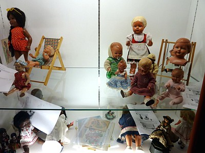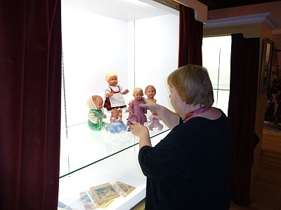Danach gingen wir in den Ausstellungsraum mit den leeren Vitrinen und besprachen die Aufteilung. „Die Chefin“ gesellte sich zu uns und siehe da, drei Frauen hatten drei Meinungen. Doch schnell wurde eine Lösung gefunden und ich freute mich, dass ich die Vitrine, die nach meinem Empfinden den absolut besten Platz hat, sozusagen der Eyecatcher der Ausstellung, für meine Bärbel-Puppen bekommen hatte. |