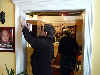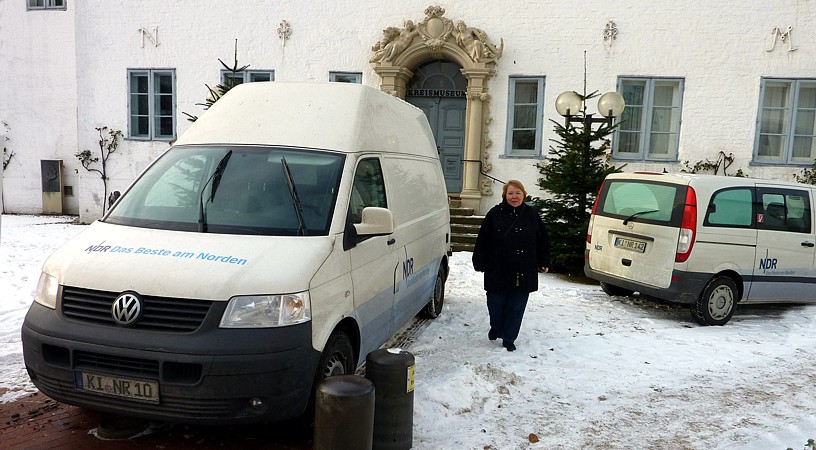Das erste Interview hatte ich ja bereits bei der Vernissage gegeben und musste dabei feststellen, es ist ein großer Unterschied, auf welcher Seite des Mikrofons man steht. Ich arbeite seit über 20 Jahren für Printmedien. Da konnte ich mir die Fragen vorher notieren, die ich stellen wollte - hier musste ich immer wieder neu auf die Fragen eingehen und, ganz ehrlich, man hat nicht immer sofort auf jede Frage eine Antwort parat. Dann kam plötzlich Bescheid aus Itzehoe, am 1. Dezember wollte das NDR Fernsehen aus Kiel kommen. Meine Puppen würden zu Fernsehstars und ich mit ihnen - naja, vielleicht würde ich nicht gerade ein Star werden, aber ich wollte mich ordentlich anstrengen, damit meine Schätze ins rechte Licht gesetzt würden und viele Menschen sich durch die Sendung animiert fühlten zur Ausstellung zu kommen. |