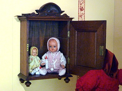 Die 2-Gesichterpuppe, die die Vitrine mit Willem teilt, wurde sehr bewundert. Sie ist nun 110 – 120 Jahre alt und lächelt oder weint noch immer wie am ersten Tag. Schaut man sie genauer an und sieht ihren hervorragenden Zustand, kann man sich kaum vorstellen, dass Sie einmal eine Rasselpuppe im Kinderwagen gewesen ist. Diese Vitrine, die zwar räumlich eigentlich die erste Vitrine ist, bildet immer den Abschluß der Führung ... |