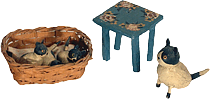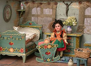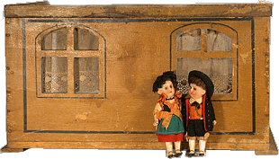 Als Bewohner meiner Dora-K.-Stube fungieren ein Trachtenpärchen mit gespritzten Porzellan-Köpfchen aus der 390er Serie von Armand Marseille und ein kleines Hartgips-Baby von Hertwig & Co./Katzhütte. |