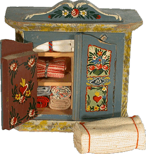 Der Schrank ist neben dem Bett das auffälligste Möbelstück. Er misst 13 x 5 x 11,5 cm. Die scheinbar zu geringe Höhe von 11,5 cm hat mich anfangs irritiert. Aber die bäuerlichen „Kästen“ waren damals wirklich niedrig! |