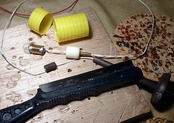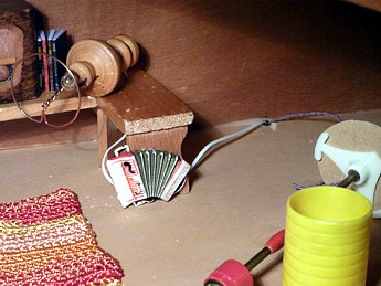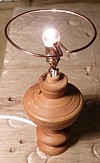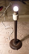 Das sollte hier im Dachgeschoss auch der Fall sein. Diese Lampe musste richtig gebastelt werden. Der Fuß ist ein abgebrochenes Endstück einer Gardinenstange, ein von Gerhard passend gebogener Draht von einem Luftballon und der Deckel einer Haarshampoo Flasche. Gerhard hat den „gedrechselten“ Fuß durchbohrt und verdrahtet. Das hat er toll hingekriegt und die Lampe gibt ein schönes warmes Licht. |