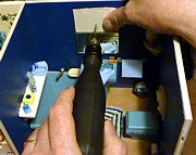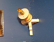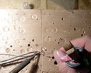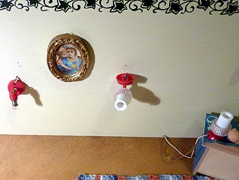 Die Wandlampe über dem Spiegel musste Gerhard ganz neu bauen. Alle Lampen, die wir gesehen haben, gefielen uns nicht, bzw. waren für unser Gefühl viel zu groß. Gerhard hat die Verschlusskappe einer Spritzflasche aus dem „Gewürzregal“ mit einer feinen Säge gekürzt und ein wenig glatt gefeilt. Oben in die geschlossene Rundung kam ein Loch für das Kabel. Da wir auch die Fassungen der kleinen Birnchen für diese Lampe als zu groß ansahen, hat er das Kabel an die Birne angelötet. Es ist eine tolle Lampe geworden und, sie ist genau so, wie ich es mir gewünscht habe. Nun ist auch das dunkle Bad hell ausgeleuchtet. |