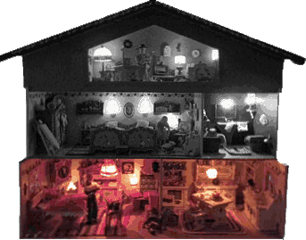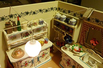 Aufhängung Die Wohnzimmerlampe war ganz neu und Gerhard brauch- te nur die Kabelenden ein wenig zu verlöten. Sie bekamen notdürftig Strom und sahen toll aus. So sollte es sein. Doch dann setzten wir das 1. OG oben drauf und man konnte deutlich erkennen. Die Küche mit den hellen Möbeln und der weißen Glaslampe war perfekt. Mein
