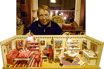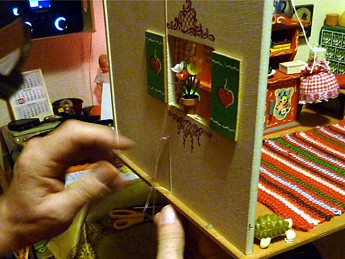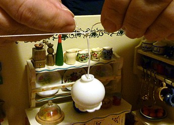 Dann hatte Gerhard die zündende Idee. Wir würden die Deckenleuchten - ähnlich wie man es in den antiken Stuben sieht - aufhängen. Dafür jedoch keinen Draht nehmen (sie sind ja schon beleuchtet) sondern ein zwar dünnes, aber sehr festes Band verwenden. Wir versuchten es probeweise - ja, klappt wunderbar. |