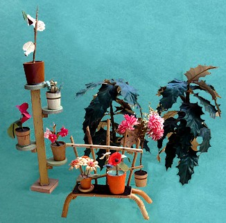 Es ist sehr schwierig die industriell hergestellten Blumen und Pflanzen einer Manufaktur zuzuordnen. Wenn ich ehrlich bin, so kann ich es überhaupt nicht. Auch in der Literatur hält man sich da sehr bedeckt, legt sich höchsten auf einen Fertigungszeitraum + / - 10 Jahre fest, ohne Herstellerangabe. Ich habe eine recht ansehnliche Fachbibliothek. Als ich jetzt noch einmal geforscht habe, konnte ich lediglich im Preisführer von Gitta Grundmann „Miniaturen“ aus dem Verlag Marianne Cieslik ein Foto und fünf der frühen Hersteller finden - die aber sowieso bekannt sein dürften. Recht interessant fand ich jedoch dort den Hinweis von Frau Grundmann: Vorsicht vor guten Replikas die als „alt“ verkauft werden. Dabei denkt sie offenbar an die Töpfe aus Holz und / oder Papiermasché mit den meistens etwas zu groß geratenen Papier- oder Seidenblüten. |