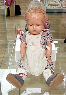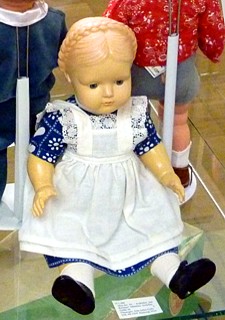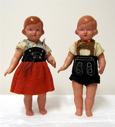 Eine bei den Sammlern sehr begehrte Celluloidpuppen ist das Cellba-Gretchen. Auch wenn die Puppe hier in Dieburg einmal als „Gretel“ bezeichnet wird, korrekt ist Gretchen. Und, damit wäre ich jetzt bei einer Cellba Besonderheit. Ich weiß nicht wie viele verschiedene Puppentypen Cellba hergestellt hat. Alle haben einfach eine Artikelnummer. In Anlehnung an Asterix & Obelix frage ich jetzt einmal: Alle? ... Nein nicht alle. Zwei Puppen aus den 30er Jahren tragen einen Namen. Eben das Gretchen mit dem geflochtenem Haarkranz und Helga mit den ebenfalls geflochtenen Affen- schaukeln. |