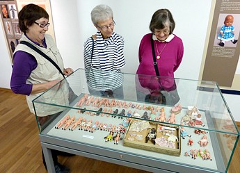 Wer wie ich nicht nur Celluloidpuppen-Sammler ist sondern auch ein großes Herz für die kleinen Stuben hat, der kommt bei dieser Tischvitrine so richtig auf seine Kosten. Die Kleinsten von Cellba lagen hier aufgereiht neben- einander. So viel verschiedene Puppentypen! Was freut diese Damen so: |