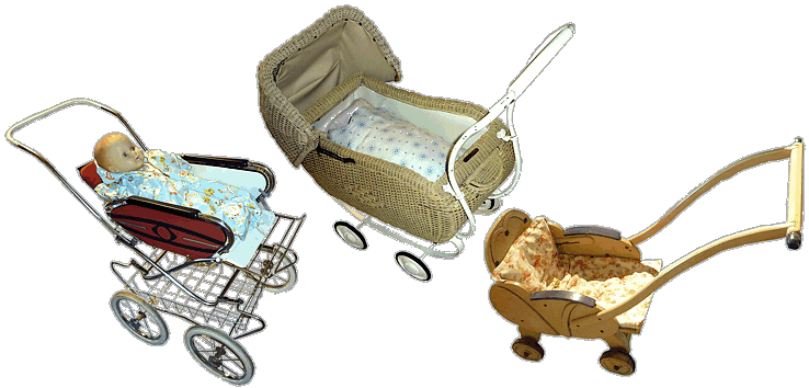 Auf einem kleinen Podest stehen unweit von Schlitten, Roller und Fahrrad auch verschiedene Generationen von Puppenwagen. Da versinkt eine Puppenmutter und -sammlerin doch sofort in ihren Träumen. |
