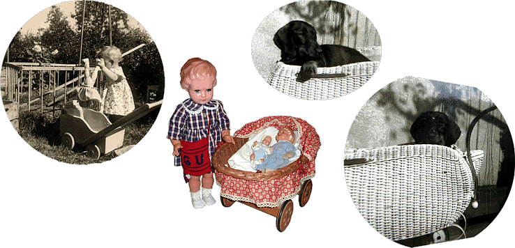 Bärbel Da ging das Stubenkörbchen dann in meinen Besitz über. Meine Oma nähte aus Vichykaro rotweiß neue Kissen und die Rüsche. So war es ein ganz anderes Körbchen, als das, was meine Schwester gehabt hatte. Sie erhielt übrigens einen tollen weißen Korb-Puppenwagen. Er hatte vorne ein kleines Extrakörbchen mit Deckel. Die Puppenmutter konnte dort ein Fläschchen für das Baby, eine Windel oder einen kleinen Schlüssel unterbringen - eben was für einen Schatz sie hatte - es war nicht immer einfach die jüngere Schwester zu sein. Eigentlich war meine Schwester dafür auch schon zu groß. Sie spielte kaum noch damit. Stattdessen hat unser kleiner Rauhaardackel ihn für sich erobert. Es war wohl sein Rückzugsort - wenn ihm der Trubel unserer großen Familie zuviel wurde - 3 Kinder, deren viele Freunde, alle möglichen und unmöglichen Haustiere (mein Bruder wollte Förster werden - Sammler war er bereits). Auf alle musste unser kleiner Stoppel aufpassen und das Rudel zusammenhalten - eben ein typischer Dackel mit viel ausgelebtem Instinkt eines Jagdhundes. |