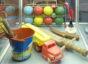 Einen wirklichen Schatz habe ich in einer Vitrine mit Spielzeug für die Straße entdeckt. Neben Tanklaster, Sandeimer und Boccia-Kugeln liegt ein hölzernes Schwert. Schauen Sie bitte genau hin - sehen Sie darin auch den Rührer, mit dem im Waschzuber die große Wäsche gedreht wurde? Im Ausstellungsführer wird dieser „Rührer“, nein, dieses Schwert auf 80er Jahre gedeutet. Natürlich ist es gut möglich, dass ein Kind es damals bekommen hat. Doch die Herkunft dürfte viel länger her sein. Ebenso der Dolch, der daneben liegt. Der wurde sicherlich von einem lieben Opa (oder anderen Verwandten) mit dem Messer geschnitzt. Eine sehr gute, aber sicher keine Manufakturarbeit. |
