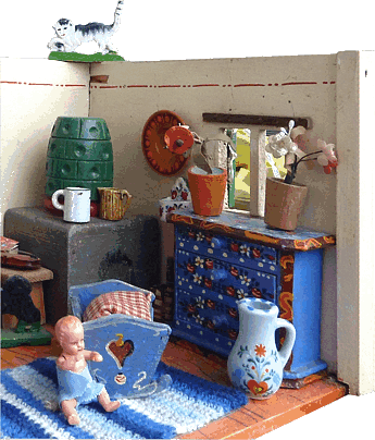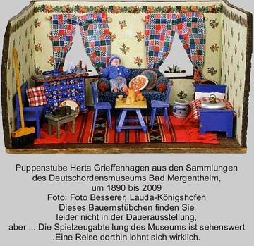 Wie ich aber schon weiter oben sagte, ist meine große Stube die mittlere dieser Stuben. Sollte mir eines Tages eine ganz große über den Weg laufen, jawohl, ich werde sie kaufen. Nur, wie sage ich das meinem Mann? Er meint doch tatsächlich, ich hätte schon eine Kuhnstube. Da sage ich nur ... Männer!! Nein, ich bin fest davon überzeugt, wenn es so weit ist, wird er sich mit mir freuen. |