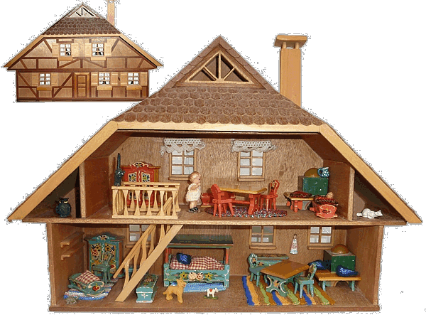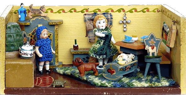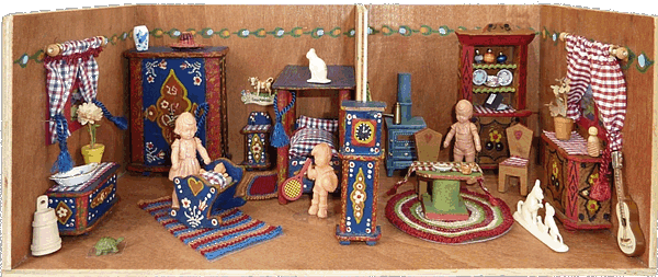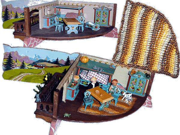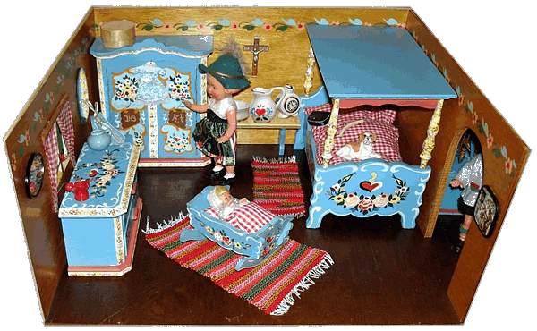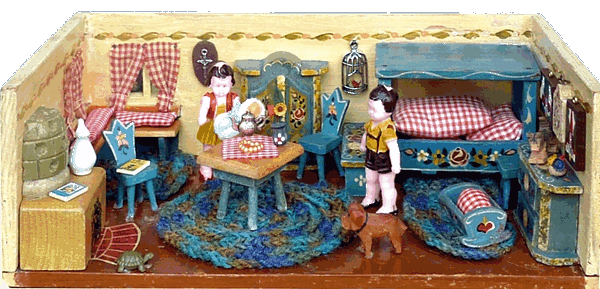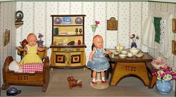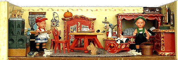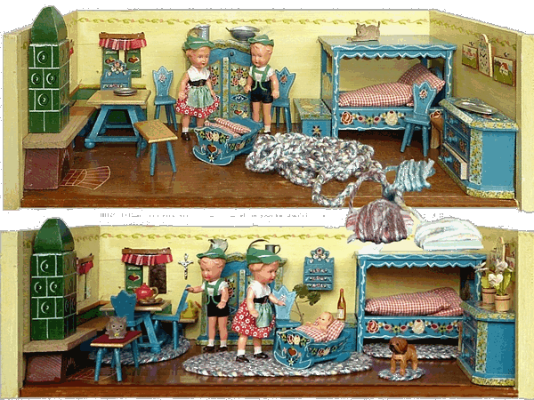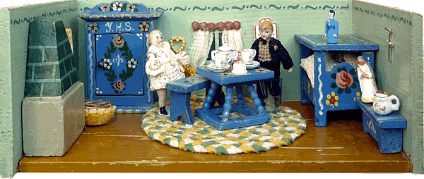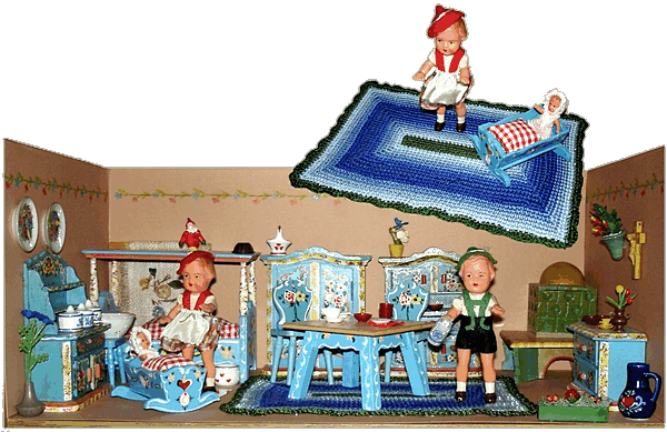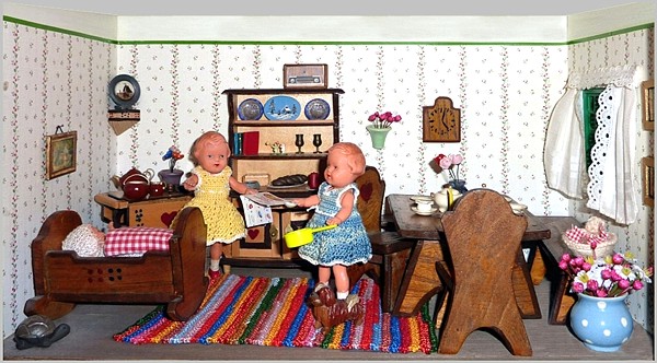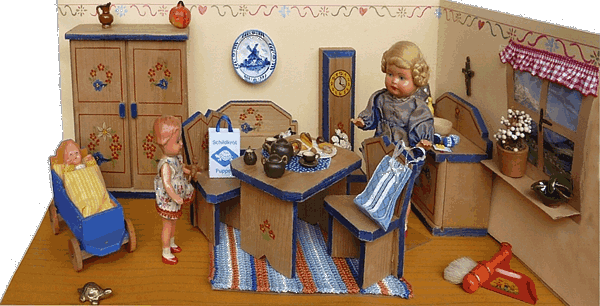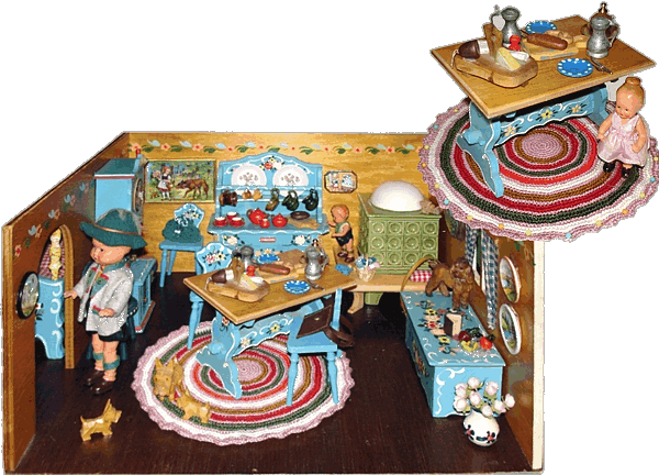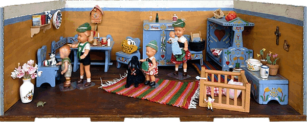 Eine meiner Lieblingsstuben ist die Bauernstube, die mein Schwiegervater 1942 für seine Tochter baute. Ich erhielt sie 2010 von meiner Schwägerin als Weihnachtsgeschenk. Die hier nachgestellte Familie Ulbrich sind Edi-Puppen in 12, 8 und 4 cm. |