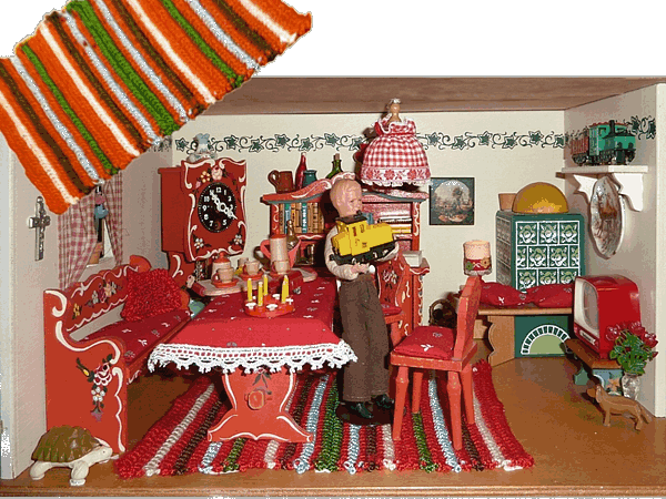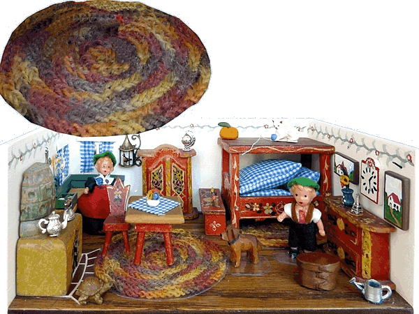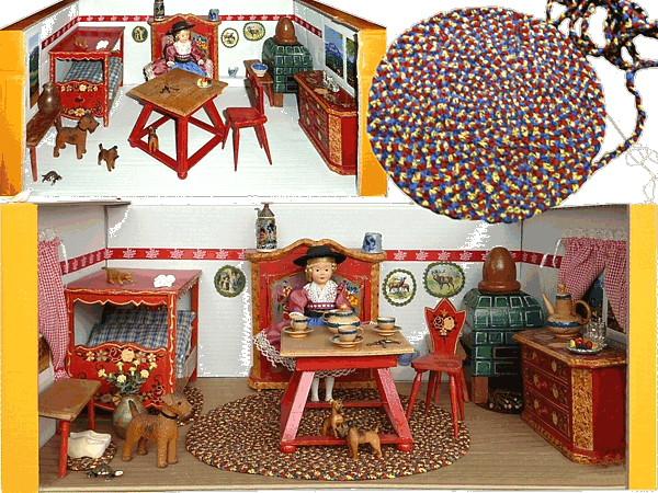 Das Gehäuse für diese Möbel von Kuhn aus den 30er Jahren in der Größe 00 - Bewohner: 4 cm Edi-Puppen - hat mir Steve gebaut. Steve ist der Mann meiner Freundin Sherri. Sie hat es zauberhaft bemalt. Als ich dafür einen Teppich machen wollte, entdeckte ich dieses Garn. Die warmen Farben haben mich gleich gefangen genommen. Einfach ideal zu den roten Möbeln. Einziger Nachteil, es war zu dick um damit für die kleine Stube einen Teppich zu häkeln. Da kam mir die Idee. Ich häkelte eine lange Kette Luftmaschen. Luftmaschen gehen natürlich sehr viel schneller als das Zöpfe flechten. Das Ergebnis ist aber ähnlich. Ich nähte die Kette zu einem runden Teppich. Das war wirklich ideal und ich fabrizierte auch gleich einen Bettvorleger und einen kleinen runden Teppich, den ich vor die Eckbank legte. |