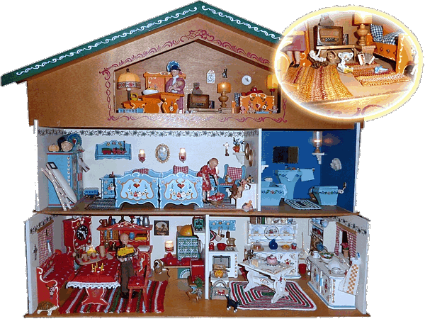 Die Möbel in der Stube oben sind etwas größer als die kleinen Möbel von Kuhn. Der Maßstab ist vielleicht 1:20 - doch auch das ist nur geschätzt. Den Hersteller konnte ich bisher nicht in Erfahrung bringen. Bewohner: 5,5 cm Hartplastikpuppen mit „sagenumwobener“ Herkunft. Die Teppiche dort habe ich ebenfalls aus Stopfgarn gehäkelt. |