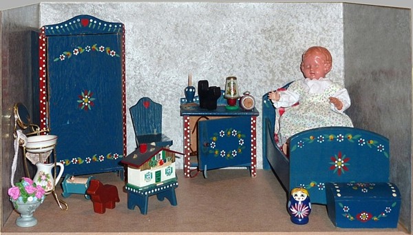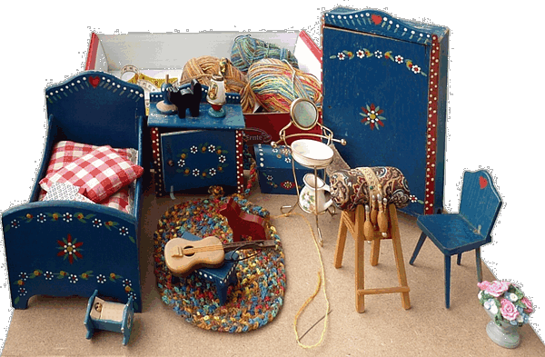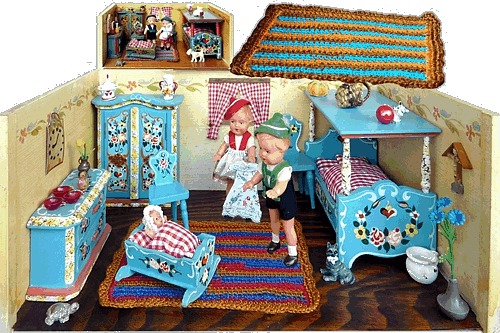 Ein Bauernmöbel-Produzent der mir besonders am Herzen liegt, ist HWE - Oberbayern - Holzverarbeitung Wiebel. Bewohner: 16, 12 und 8 cm Edi-Puppen. Ich liebe diese geraden Möbel ohne Schnörkel, aber dafür mit wunderschöner und vielseitiger Bemalung. Auch hier liegt ein aus Perlgarn gehäkelter Teppich. |