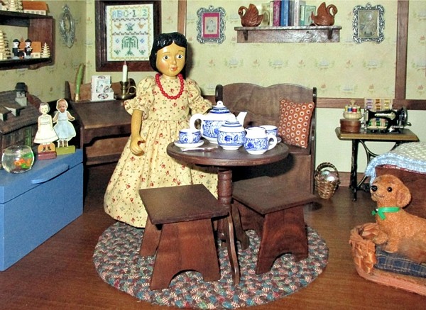 Mein Blick fiel in die Bauernstube aus meiner Kindheit - die Puppenmädchen sind 12 cm Edi-Puppen. Natürlich liebe ich diese Stube. Doch ich musste zugeben, es könnte etwas mehr „Wärme“ hinein. Ja, ich wollte einen Teppich dafür häkeln. In warmen Farben, aber bunt - eben Country like - oder das, was Lieschen Müller dafür hält. |