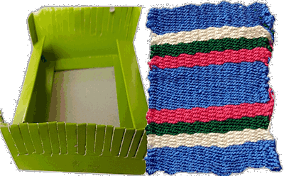 Als ich meiner Freundin Angelika Tauche-Eller davon erzählte, sagte sie spontan - nimm doch eine Pappschachtel. Ja, und das machte ich. Ich suchte eine kleine stabile Schachtel und schnitt sie an den Schmalseiten ein - so gleichmäßig, wie ich es eben kann. Vielleicht sollte ich gestehen, dass ich vorher noch nie gewebt habe. Ich probierte einfach ein wenig herum. Als Grundgarn nahm ich Spitzengarn und als Webgarn wieder mein Perlgarn. Das war aber ein Fehler. Mit dem Punchgarn oder der Stopfwolle wäre ich besser beraten gewesen. Es filzt sich besser zusammen. Trotzdem bin ich recht zufrieden. Der Teppich ist sehr fein und kann dementsprechend jede kleine Stube zieren. Einen festen Platz hat er noch nicht. |