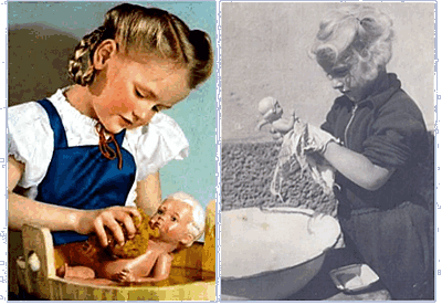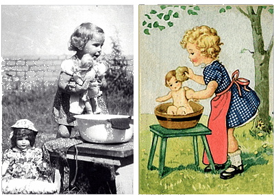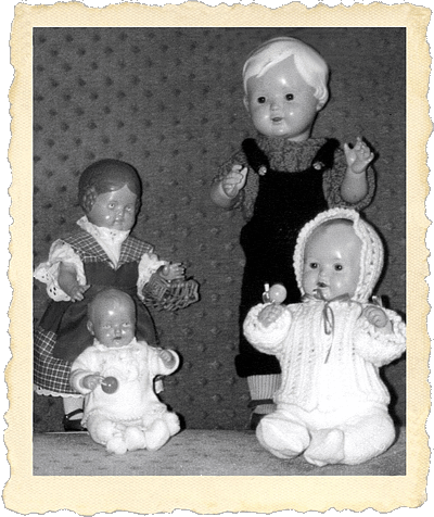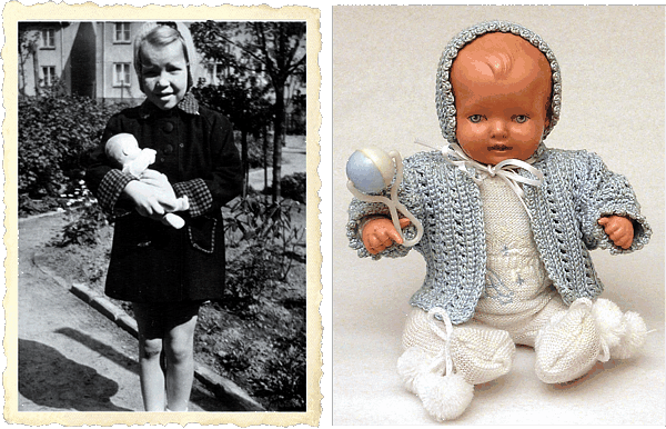 Ich war 3 oder 4 Jahre, Bärbels Gesicht und die Haare waren abgewaschen und farblos. Ich ging mit meiner Mutter zum Puppendoktor und hielt Bärbel fest an meine Brust gedrückt. Ich denke heute, dass ich bestimmt große Angst um mein Puppenkind hatte. Da beugte sich der „Doktor“ über die Verkaufstheke zu mir herunter, sah meine Puppe an und sagte (ich weiß es noch wie gestern): „Was hat denn Deine Bärbel?“ |