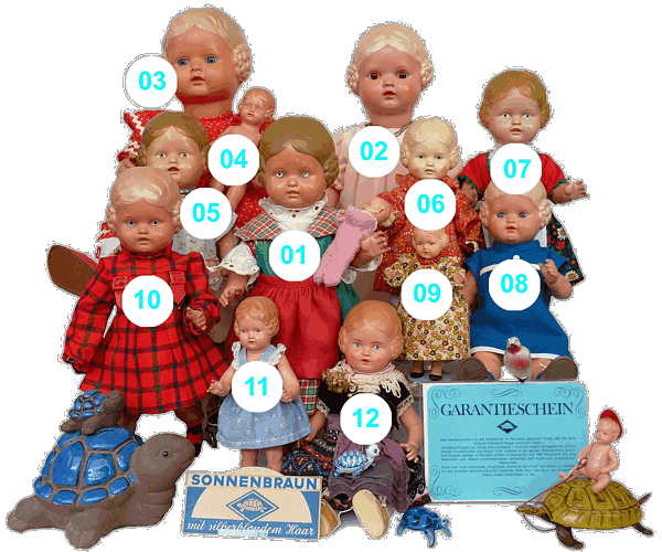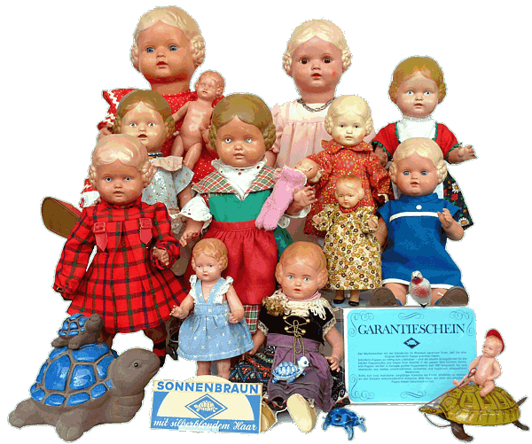 Diese Puppe ist - vor allen Dingen in den kleineren Größen - wirklich bezaubernd. Auch ich konnte ihrem Charme nicht widerstehen. Ich habe mir extra zu meiner Ausstellung in Itzehoe ein Bienchen gekauft. Obwohl sie weder von der Zeit, noch vom Material zu meiner Sammlung passte. Ach ja, hier noch der Hinweis, Schildkröt hat mit dem Werkstoff häufig experimentiert. Nicht alles, was hart und fest ist, ist Tortulon. Es gab auch ein Material, was Schildkröt Tortulflex nannte und die Schildkröt-Puppen Modell Käthe Kruse waren aus einem Material, was Schildkröt Demiflex nannte. Später kam dann auch noch Celidor hinzu. |