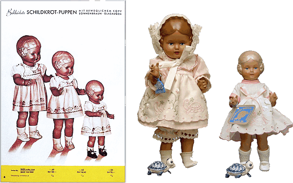 Der Katalog von 1951 hat auf einmal einen ganz neuen Aufbau. Wurde in den früheren Katalogen stets immer eine Puppe in den angebotenen Größen gezeigt, wurde die Darstellung ab 1951 nach Größen - gemischt mit allen Schildkrötkindern - vorgenommen. |