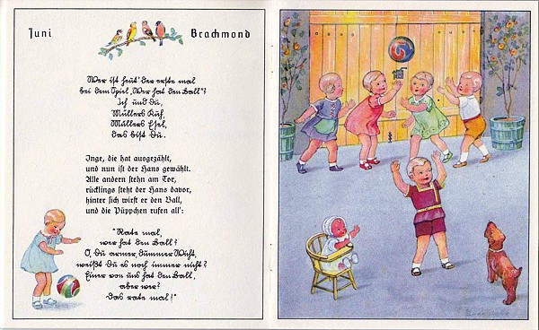 Schildkröt brachte jedes Jahr eine kleine Werbebroschüre - Hauptdarsteller waren immer die Celluloidpuppen der Schildkröt- Familie. Das Heftchen von 1941 hatte den bezeichnenden Namen „Spiele für das ganze Jahr“. Ich zeige Ihnen diese Seite, weil hier Bärbelchen und die anderen Mitglieder der Schildkröt-Familie so nett dargestellt sind und natürlich, weil diese Seite eben für den Juni ist. Dem Monat, in dem wir den Puppen-Gedenktag begehen. |
