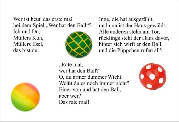 Meine Freundin Nicole hat mir einmal erzählt, dass sie die alten deutschen Schriften nicht lesen kann. Ich weiß, dass sie damit nicht allein ist. Daher habe ich für alle Nicoles den Text „übersetzt“. Ich habe versucht etwas über dieses Spiel heraus zu finden. Doch leider - nichts. Vielleicht war es nur als Reim für dieses Büchlein kreiert. |
