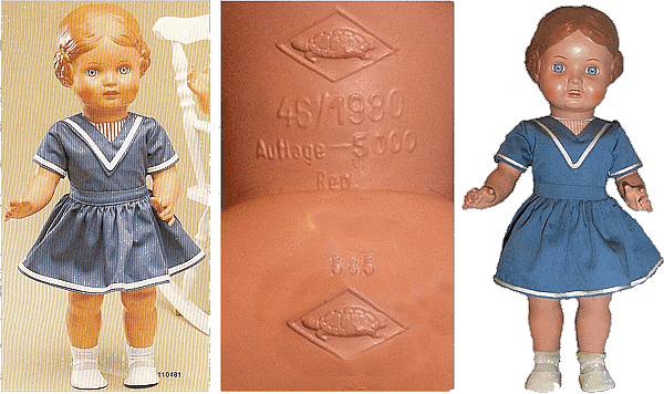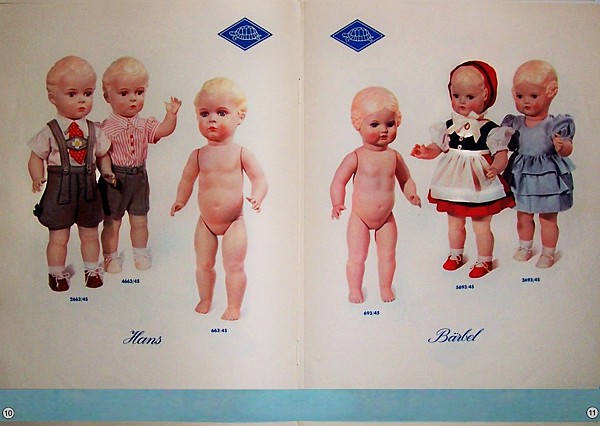 Im Händler-Katalog von 1938 - ich habe diesen Katalog samt Händlerpreisliste - erscheint Bärbel zum ersten Mal und dies gleich in sechs Größen (18,5 - 25,5 - 29,5 - 34 - 45 - 49) und verschiedenen Ausführungen in fleischfarbig oder Sonnenbraun, mit gemalten Augen oder Glasaugen und in der Größe 49 cm sogar mit lebende Augen mit Wimpern. Die kleinen Größen sind 4-fach gegliedert. Sie haben also einen festen Kopf. Die großen Puppen haben einen beweglichen Kopf und sie werden in einem Hemdhöschen geliefert. |