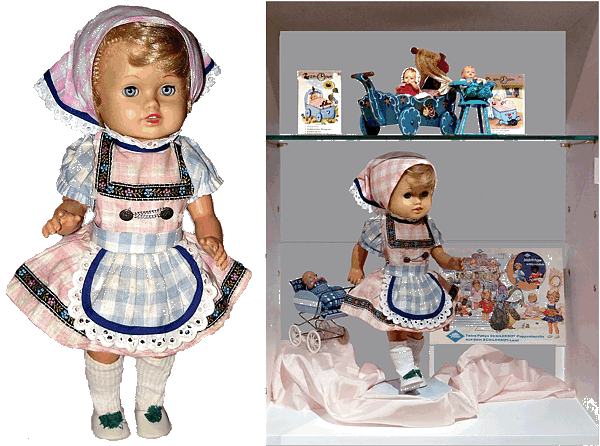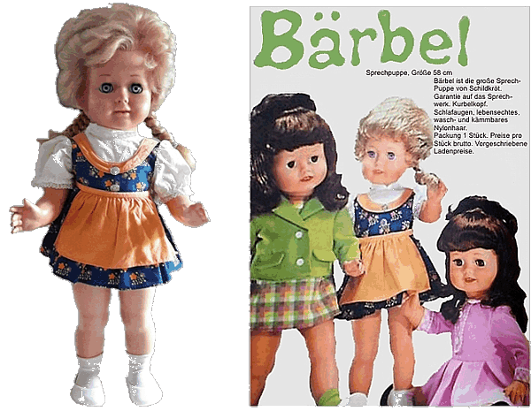 Im Katalog von 1961 gibt es keinen Hinweis mehr auf Bärbel, bzw. noch keinen Hinweis auf Bärbel. Denn ... Im Katalog von 1962 wird eine Sprechpuppe mit dem Namen Bärbel vorgestellt. Sie ist stattliche 58 cm groß und kann sprechen - Dank eines Sprechwerkes in ihrem Bauch und unter Mithilfe von kleinen Schallplatten. Der Körper dieser Puppe ist aus festem Material und der Kopf aus weichem, vielleicht Gummi oder Vinyl. Die Nylonhaare wurden eingenäht. |