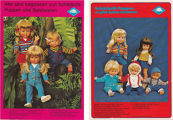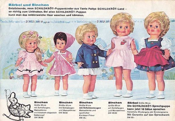 1973 - rechts - wird die Sprech-Bärbel immer noch angeboten, aber mit glatten langen Haaren. Im linken Katalog, der leider kein Erscheinungsjahr trägt, aber aufgrund der Farbgebung und Aufmachung sicherlich ebenfalls aus den 70er Jahren stammt - wird der Preis für Bärbel mit DM 69,90 und rechts im 1973er Katalog mit DM 77,50 angegeben, also DM 7,60 teuer, was mich zu dem Schluss veranlasst, dass der linke Katalog früher ist. Im Laufe der Jahre gab es leider immer wieder Kataloge ohne Jahreszahl - was ich als äußerst seltsam bezeichnen möchte. Es erschwert uns Sammlern heute die Recherche erheblich. Doch an Sammler hatte man damals wohl noch nicht gedacht. |
