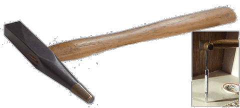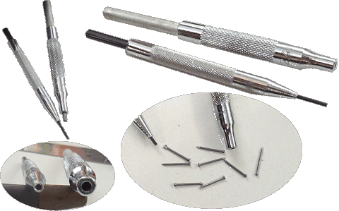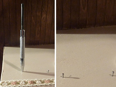 Mit meinem kleinen Bohrer bohre ich ein kleines Loch vor, stecke den auf die richtige Länge geschnittenen Nagel (das mache ich mit einem normalen Seitenschneider) hinein und schlage ihn mit Hilfe des Durchschlägers ein. Wenn Sie links auf das Foto schauen, sehen Sie den kleinen runden Rand um den Nagel herum. Der Durchschläger ist für Metall gedacht, er hat eine ziemlich starke Durchschlagskraft. Man muss ihn also mit Bedacht einsetzen. |