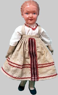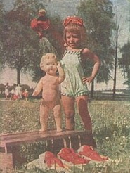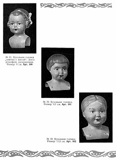 Dennoch waren diese Puppen in den 50ern bei den Kindern der Sowjetunion sehr berühmt und beliebt. Die 32 cm große Puppe (links sowie