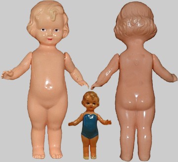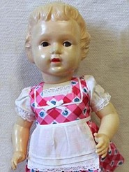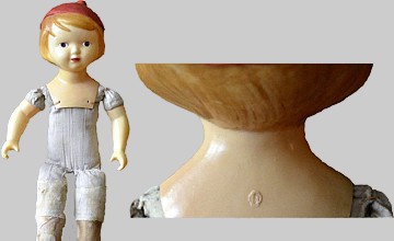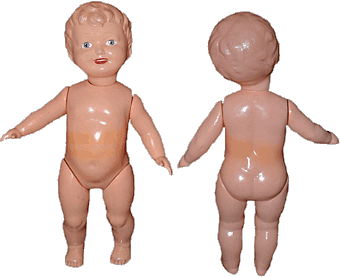 Polsterkörper In den Nachkriegsjahren wurde die Herstellung von Spielzeug in OXK wiederaufgenommen - zuerst nach alten Modellen, doch die Qualität der Zeichnung reichte an die frühen Puppen nicht mehr heran, auch war das Zelluloid selbst schlechter. |