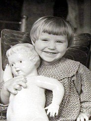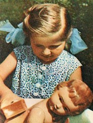 Puppe Und natürlich - eines der populärsten Nachkriegsmodelle, eine Babypuppe in der Größe von ca. 50 cm mit kurzem lockigem Haar - Bild 20. Wie üblich wurde sie nicht nur in dieser Variante bei OXK hergestellt, sondern neben den Puppen mit gemalten Augen gab es auch bei diesem Modell sehr seltene Puppen mit Schlafaugen - Bild 21. |