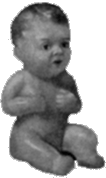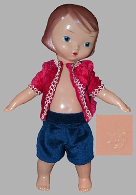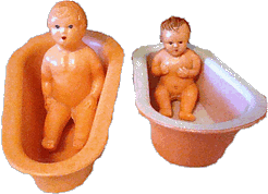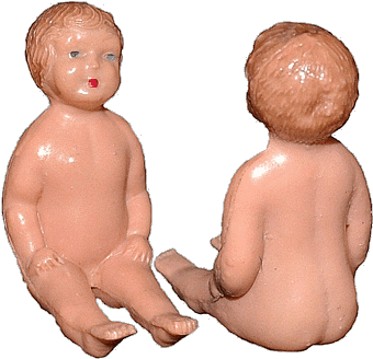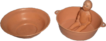 Die Fabrik ignorierte die ganz kleinen Puppen auch nicht - diese 5 cm Badepuppe erinnert uns an ähnliche Modelle von Minerva. Bei Buschow & Beck waren diese Puppen zwischen 3 und 7 cm hoch. Die Fotos sind aus dem 1954 Katalog. Alle Badepuppen wurden einzeln oder im Set mit Wasch- schüsseln oder Badewannen verkauft. So eine Puppe mit der Badewanne in der Sammlung zu haben ist heute schon etwas ganz Besonderes. |