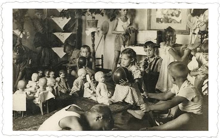 Aber das ist eine ganz andere Geschichte. Und ein vor langer Zeit im Spielzimmer des Betriebskindergartens aufgenommenes Bild ist die beste Illustration der endlosen Puppengeschichte. |