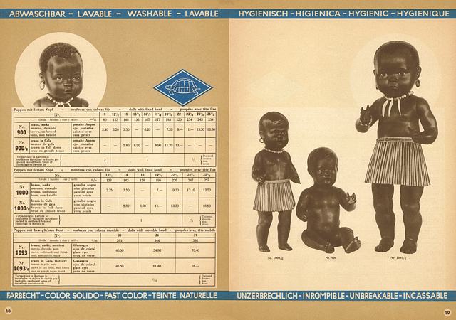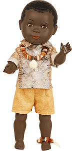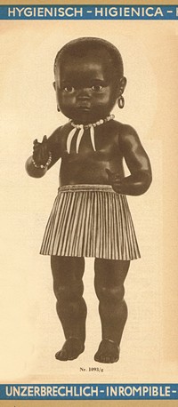Anfang des letzten Jahrhunderts, auf dem Höhepunkt der Kolonialherrschaft war der Wunsch nach ein wenig Exotik in den eigenen Vierwänden und die Neugierde der Daheimgebliebenen auf ferne Länder und ihre Bewohner ganz enorm. Nicht nur die alten Kaufmannsfamilien in Hamburg, schmückten ihre Häuser mit Trophäen aus Afrika, Asien und Südamerika. Die Erzählungen der Rückkehrer und der Seeleute drangen bis nach Thüringen, Nürnberg und natürlich auch nach Mannheim vor. Die ersten „Neger“*) und „Mulatten“*) findet man 1908 im Schildkröt Katalog. Dabei handelt es sich jedoch eher um Figuren denn Spielpuppen. Diese kamen in den 30er Jahren in die Produktion. Erst als Bebi 1925 und später als Puppen mit dem typischen Gesichtsausdruck und der krausen Haartracht der afrikanischen Ureinwohner