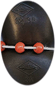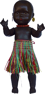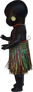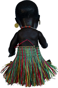 Die Perlen der roten Kette sind aus Glas oder aus einem Kunstglas. Sie sind auf einem dünnen Gummiband aufgezogen. Es sind nur 14 Perlen. Ob sie schon welche verloren hat, kann ich nicht mit Bestimmtheit sagen. Alle Puppen die ich bisher gesehen habe, haben viele „Fehlstellen“ in ihren Ketten. Bedingt durch den festen Bastrock mit sehr starren Bast, kann sie nicht sitzen. Das Röckchen setzt auf die Sitzgelegenheit auf und hält den kleinen Po ca. 3 cm über dem Boden hoch. |
