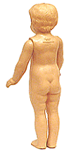 Bei beiden fallen die Speckröllchen an Händen, Handgelenken und Beinen, insbesondere an den kunstvoll ausgeformten Knie- und Fußgelenken auf. Sie haben sehr große Füße mit 10 sehr schön modellierten erkennbaren Zehen, auf denen sie, ähnlich wie die Verwandten aus Porzellan, auch gut stehen können. Nicht ganz zum Köper passend und etwas rührend anzusehen, sind die kleinen „Hängepopos“. |